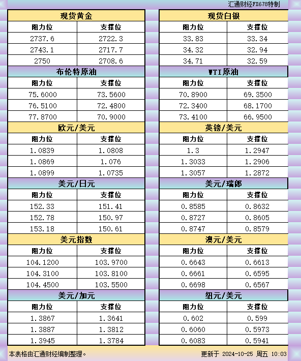10月25日亚市支撑阻力:金银原油+美元指数等六大货币对