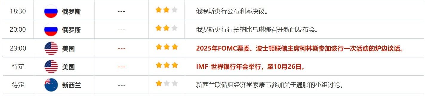 汇通财经APP讯——以下是周五 ( 10月25日)财经早餐,包括基本面重要消息、贵金属/原油/外汇/商品/股市/债市等行情、国际要闻、国内要闻、机构观点、今日财经重要数据及财经大事。澳新银行警告,黄金长期上涨,但短期内可能面临上涨动能减弱的风险。美国上周初请失业金人数减少,创2024年9月28日当周以来新低,美元和国债收益率获提振。美国和以色列将试图重启加沙停火磋商,周四国际原油出现下跌。