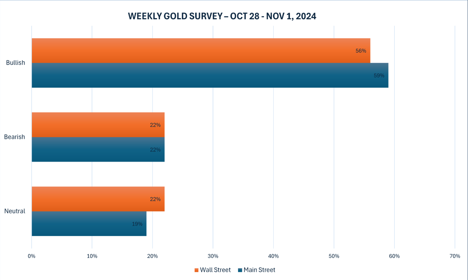 在本周黄金市场调查中,共有9名专业分析师参与,其中5名分析师(约56%)预计下周金价将上涨,另有2名(22%)预测金价下跌,余下的2名(22%)持中立立场。与此同时,在线调查则收到了213位散户投资者的投票,其中126位(59%)看涨金价,47位(22%)看空,剩余40位(19%)预计金价将在当前水平波动。