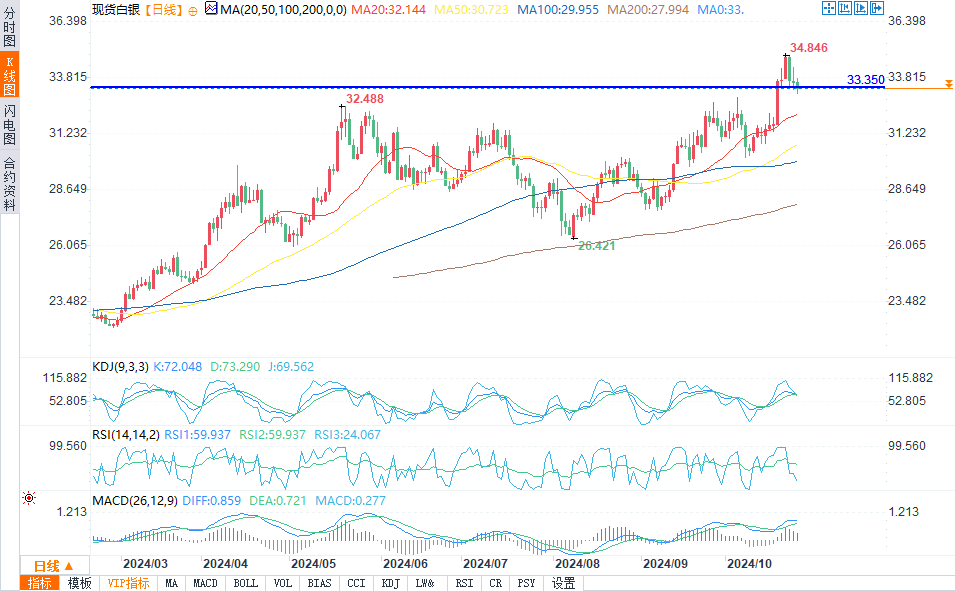 汇通财经APP讯——周五(10月25日)欧盘时段,白银价格连续第三天承压,在33.50美元附近交易。银价近期的下滑主要归因于美元走强和美国国债收益率上升。