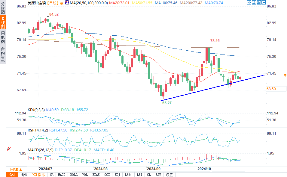 市场预测:上涨潜力有限,有看跌趋势短期内,如果地缘政治紧张局势不进一步升级,原油价格可能面临阻力。随着技术指标指向平衡,区间波动市场,移动平均线显示下行压力,除非出现新的需求驱动因素,否则前景仍然看跌。