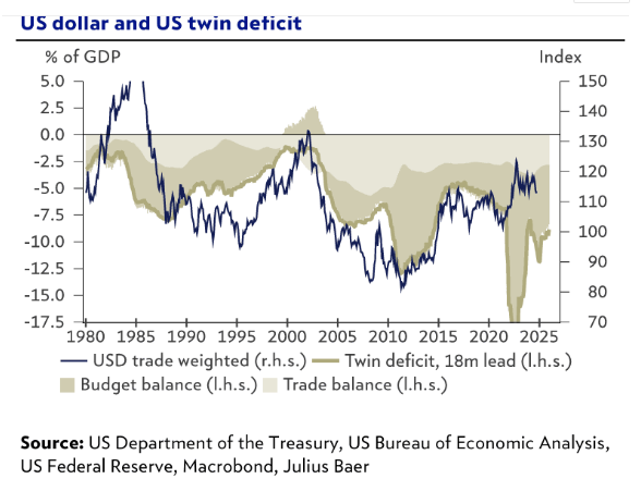 图:美元和美国双赤字(蓝线指美元贸易加权,黄线指双赤字,淡黄指预算余额,浅白指贸易余额)
