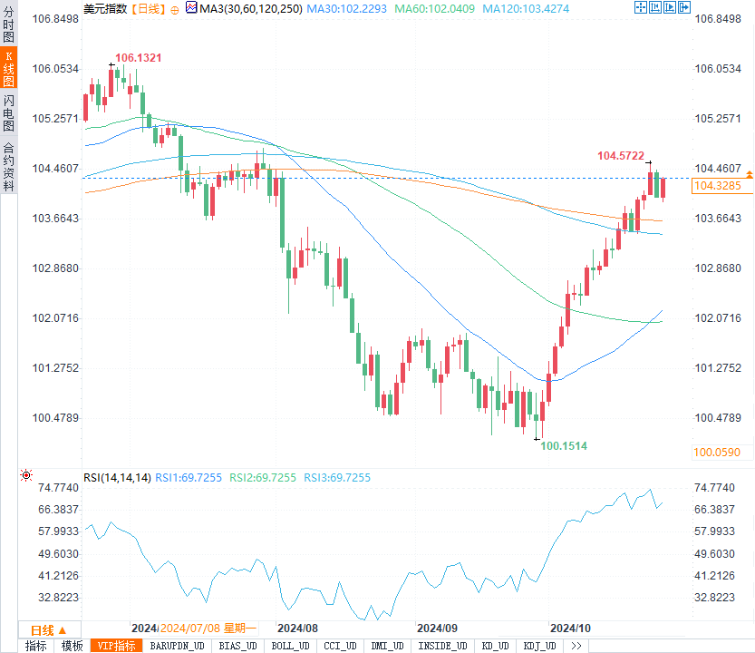 走势回顾美元指数本周表现强势,累计上涨0.74%,有望连续第四周走高。美元兑一篮子货币的汇率在周五上涨0.18%,达104.24点。美国公布的企业支出数据超出预期,使得市场对美联储降息的预期有所缓解,进一步推高了美元的吸引力。