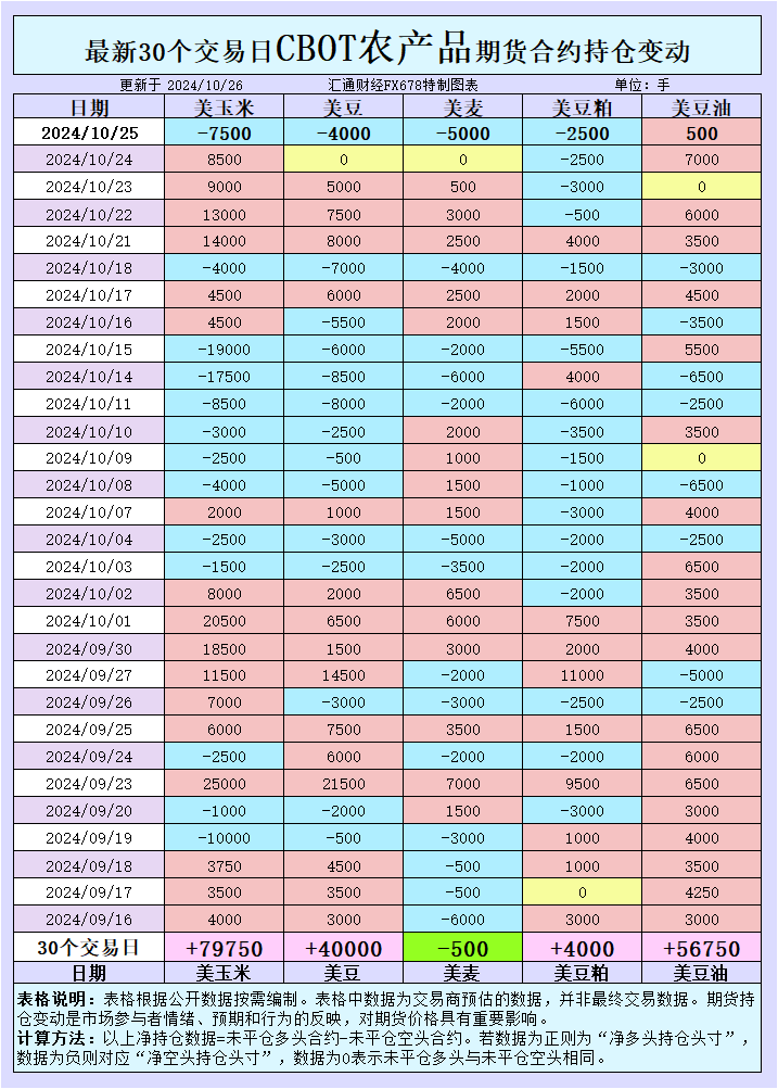 增加CBOT玉米投机性净空头;增加CBOT大豆投机性净空头;增加CBOT小麦投机性净空头;增加CBOT豆粕投机性净空头;增加CBOT豆油投机性净多头。