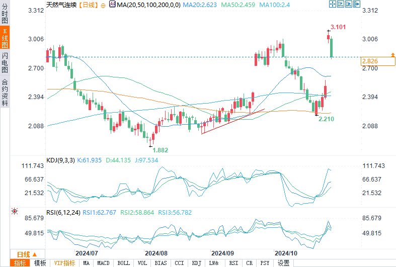 北京时间00:14,美国天然气报2.809美元/百万英热,跌幅9.15%。