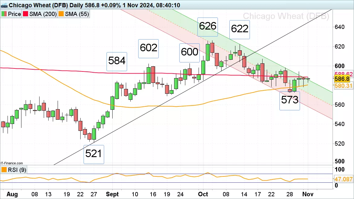 美国小麦期货价格已从周一573点的低点反弹,过去三天一直在测试10月下行通道阻力线和586 - 589之间的200日移动均线。