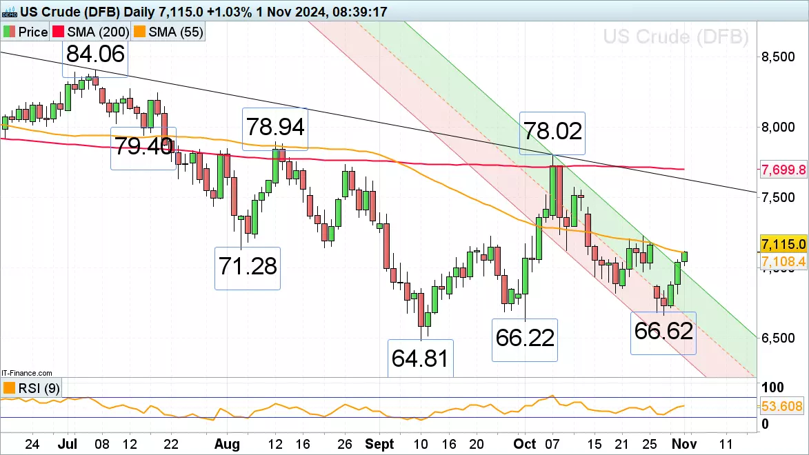 最近西德克萨斯中质原油(WTI)近月期货价格大幅下跌至周二的低点66.62,随后由于中东局势升级而迅速反弹近6%。对伊朗和以色列之间的紧张局势以及可能出现的供应中断的担忧,已将油价推高至55日简单移动平均线(SMA) 71.08,上周的高点72.29是阻力位。如果突破,底部将形成,10月78.02的峰值将再次出现。