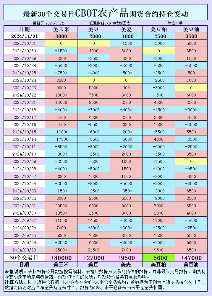增加CBOT玉米投机性净多头;增加CBOT大豆投机性净多头;增加CBOT小麦投机性净多头;增加CBOT豆粕投机性净空头;增加CBOT豆油投机性净多头。