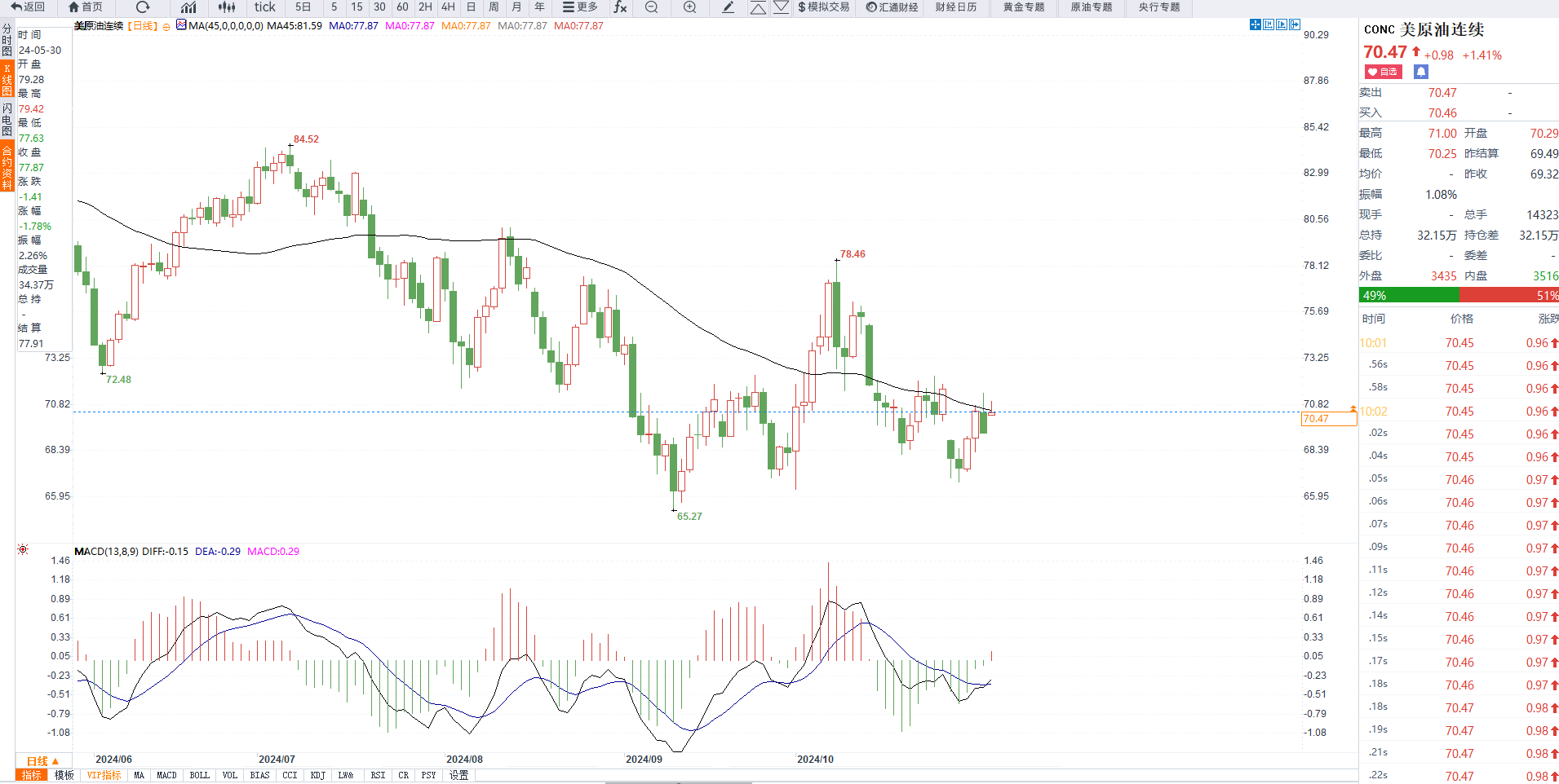 美原油亚盘时段高开跳涨逾1%,目前交投于70.47美元/桶附近。而上周五,美国非农数据意外爆冷,但市场对于美联储降息预期依然存在分歧。有部分观点认为10月非农数据的降低,是因为飓风和波音公司的罢工导致,影响不大,而从美债长端收益率上来看,也没有大幅下跌。