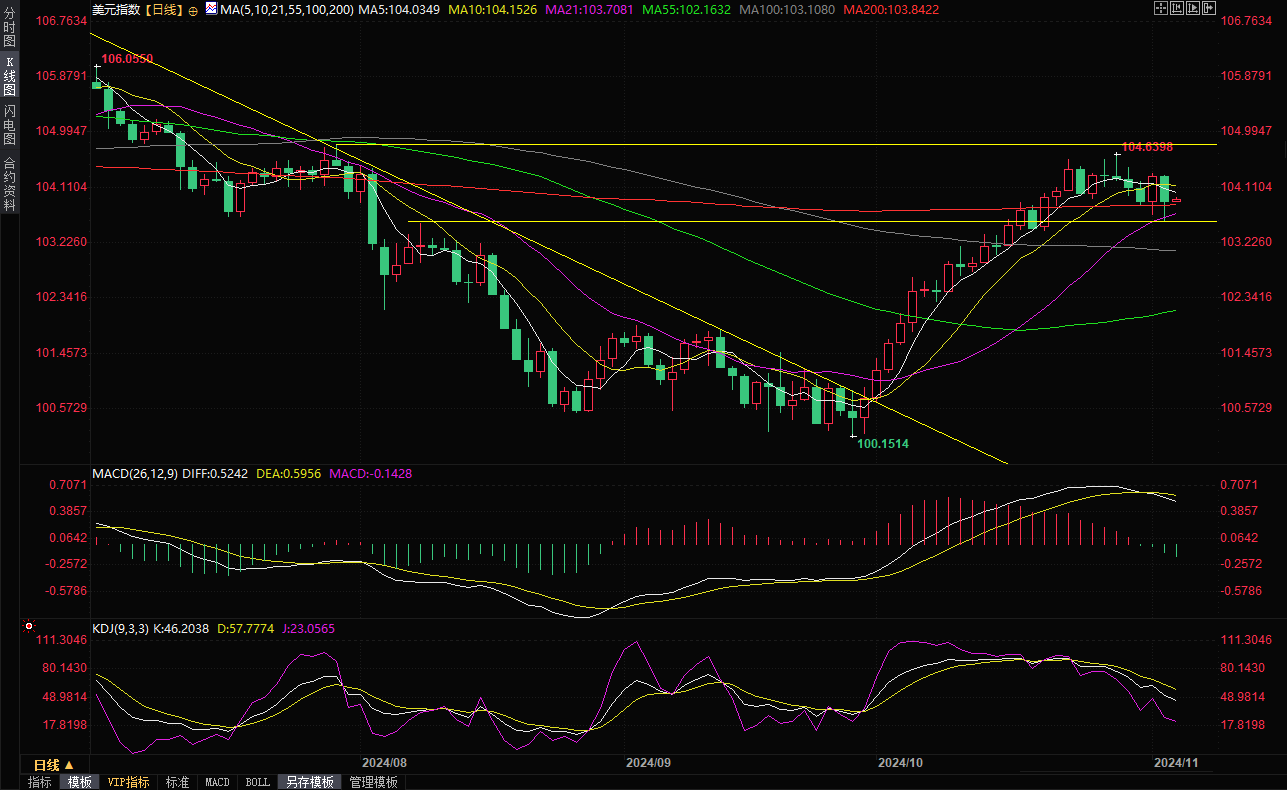 美元指数窄幅震荡,勉强守在200日均线103.84上方,目前交投于103.94附近。美元周一下滑0.4%,盘中一度创近两周新低至103.58,收报103.95,因投资者撤出了特朗普交易。最近几周,特朗普交易受益,因投资者猜测共和党前总统特朗普更有可能在周二的总统大选中战胜民主党副总统哈里斯。