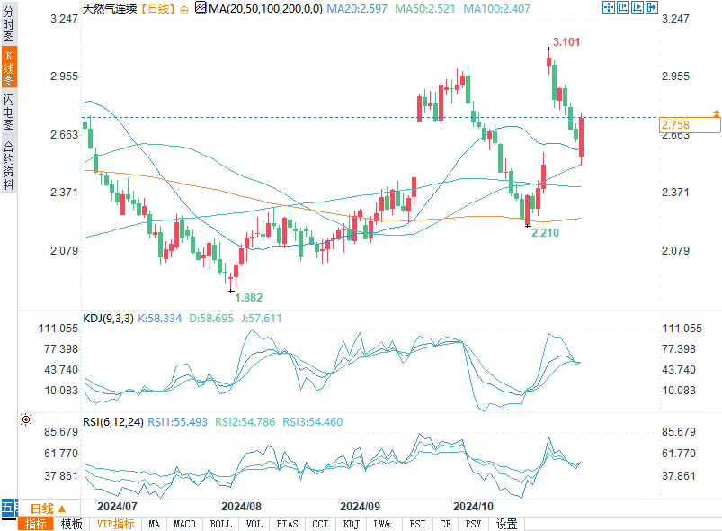 由于温和的天气和高产量使需求保持低位,天然气价格的近期前景仍然悲观。如果没有明显的天气变化或液化天然气出口的增加,天然气价格可能会进一步下跌,支撑位在2.201美元附近。交易商应密切关注2.585美元水准,因突破该水准可能引发短暂的空头回补反弹,不过基本面压力指向持续走软。