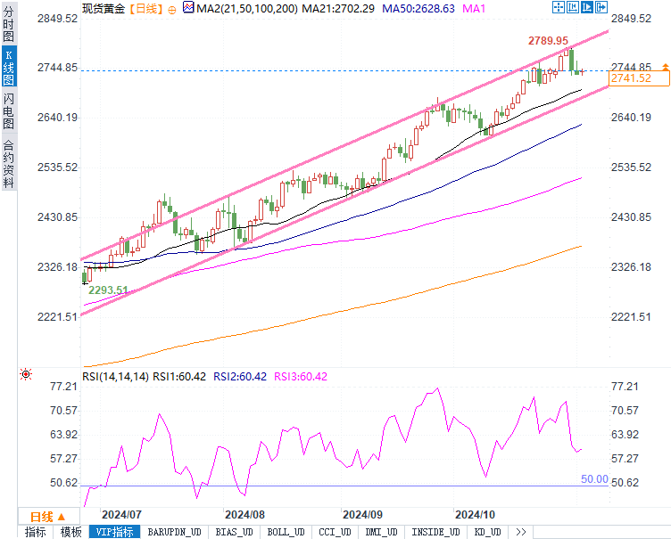现货黄金上涨0.20%,报于每盎司2740.39美元。随着大选结果的不确定性和美联储可能降息的预期,黄金作为避险资产的需求有所提升。分析师普遍认为,在目前的政治环境下,市场对美元的看法偏向谨慎,可能有助于支撑黄金价格。知名机构的经济学家指出,若哈里斯获胜并延续现有政策,美元可能走弱,而黄金的避险属性将进一步凸显,吸引更多买盘。