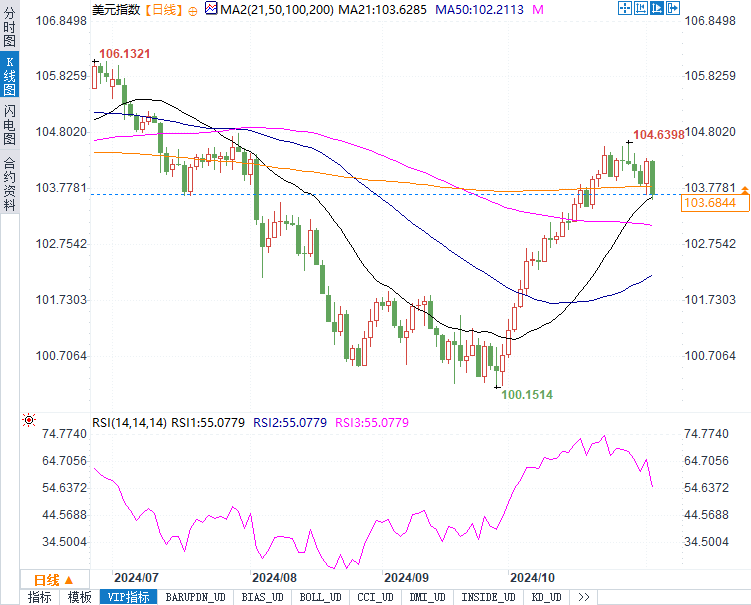 美元指数下跌0.63%,报103.6541,反映出市场对未来美联储降息的预期影响力正在加大。美元近期的走弱一方面受到美国大选不确定性的影响,另一方面则是市场预期美联储将在12月再次降息。知名机构预计本周降息25个基点至4.50%-4.75%的可能性已达100%,而未来几个月或将再度降息以应对经济下行压力。