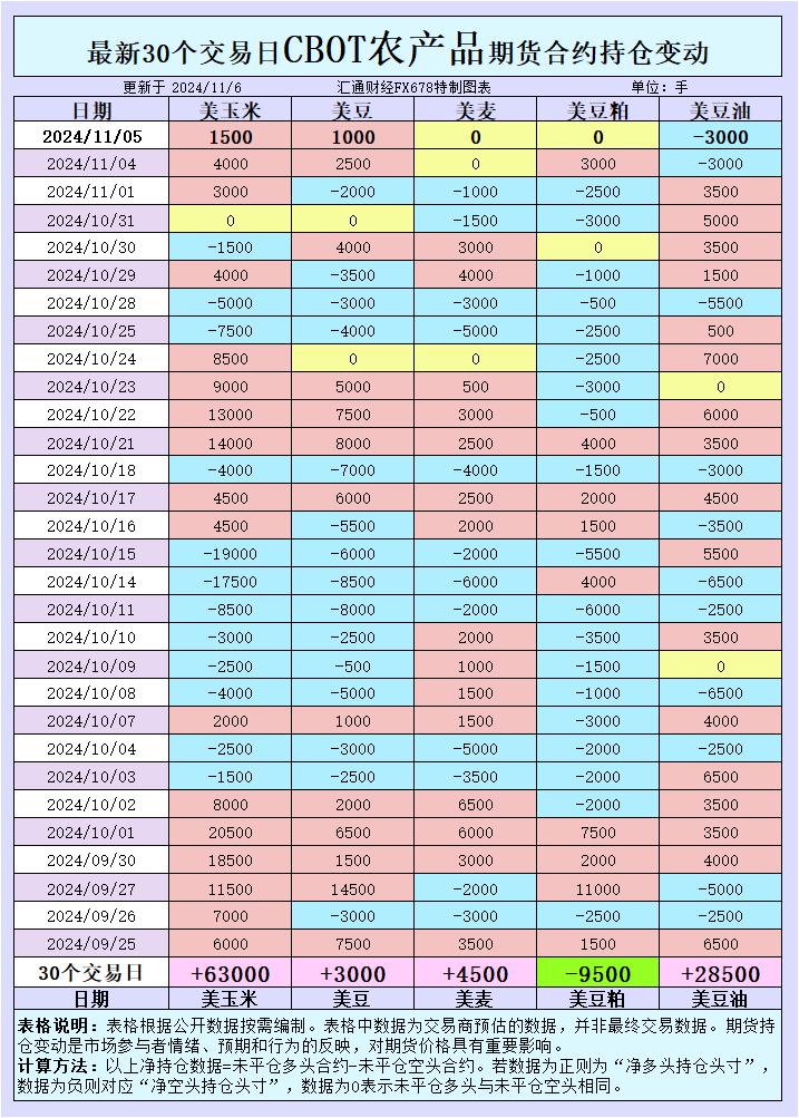 2024年11月5日当日,大宗商品基金:增加CBOT玉米投机性净多头;增加CBOT大豆投机性净多头;CBOT小麦未平仓多头与未平仓空头相同;CBOT豆粕未平仓多头与未平仓空头相同;增加CBOT豆油投机性净空头。