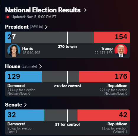 截至美东时间晚上9点(北京时间周三10:00),特朗普在赢得肯塔基州、印第安纳州、西弗吉尼亚州、阿拉巴马州、佛罗里达州、俄克拉荷马州、密苏里州和田纳西州等州后,已获得154张选举人票;哈里斯在赢得佛蒙特州、马里兰州、马萨诸塞州和华盛顿特区后,仅获得27张选举人票。候选人需要在各州选举人团中获得总计270票才能当选总统。