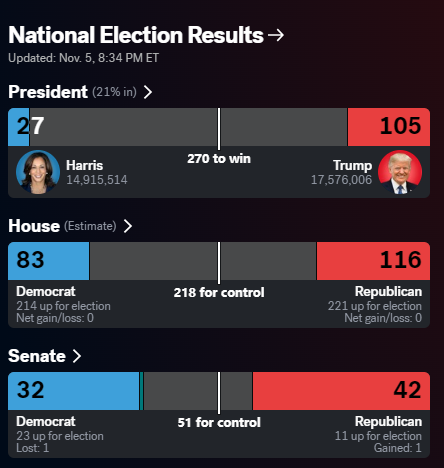 众议院席位中,特朗普已经获得116张选票,哈里斯仅获得83张选票;众议院总共435张选票,提前获得218票赢赢下众议院。