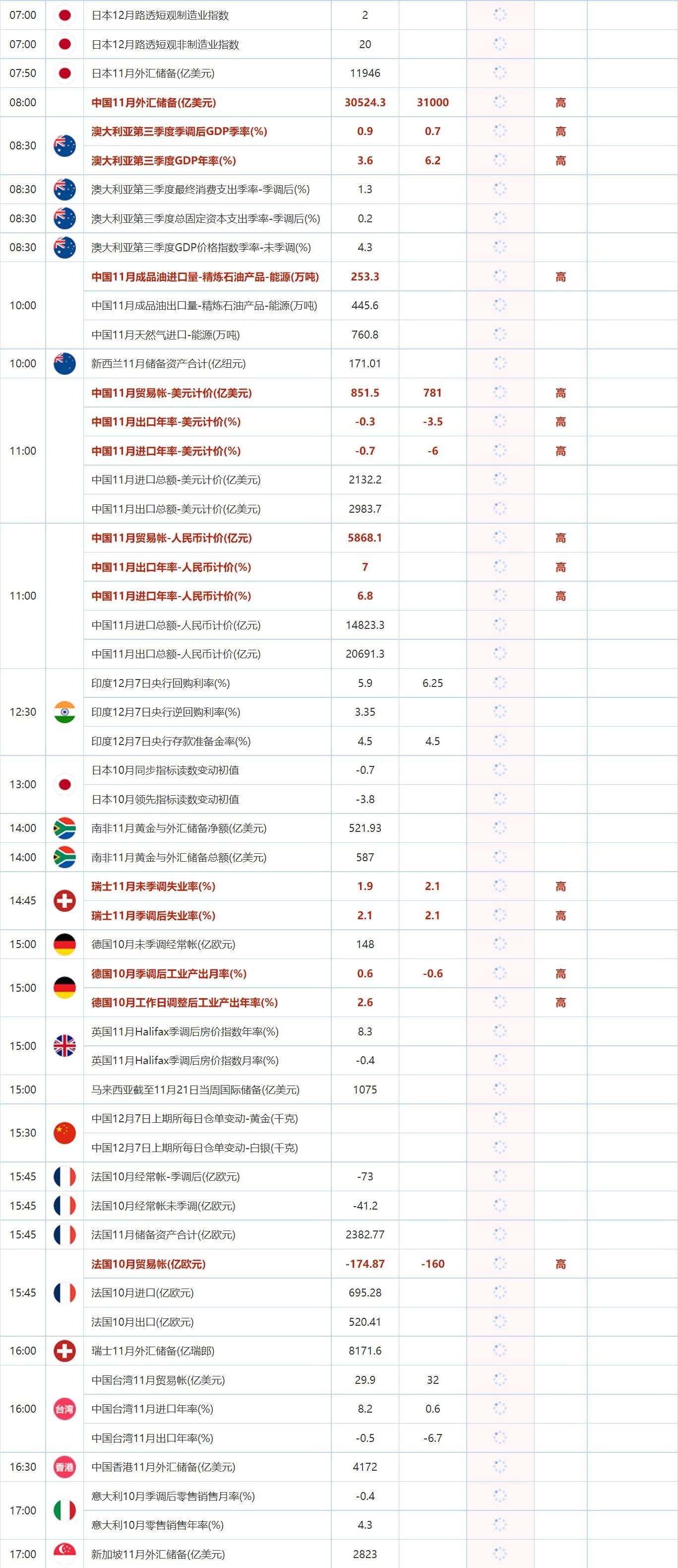 08:00 中国11月外汇储备(亿美元) , 前值 30524.3 , 预期值 31000 , 公布值:待发布08:30 澳大利亚第三季度季调后GDP季率(%) , 前值 0.9 , 预期值 0.7 , 公布值:待发布