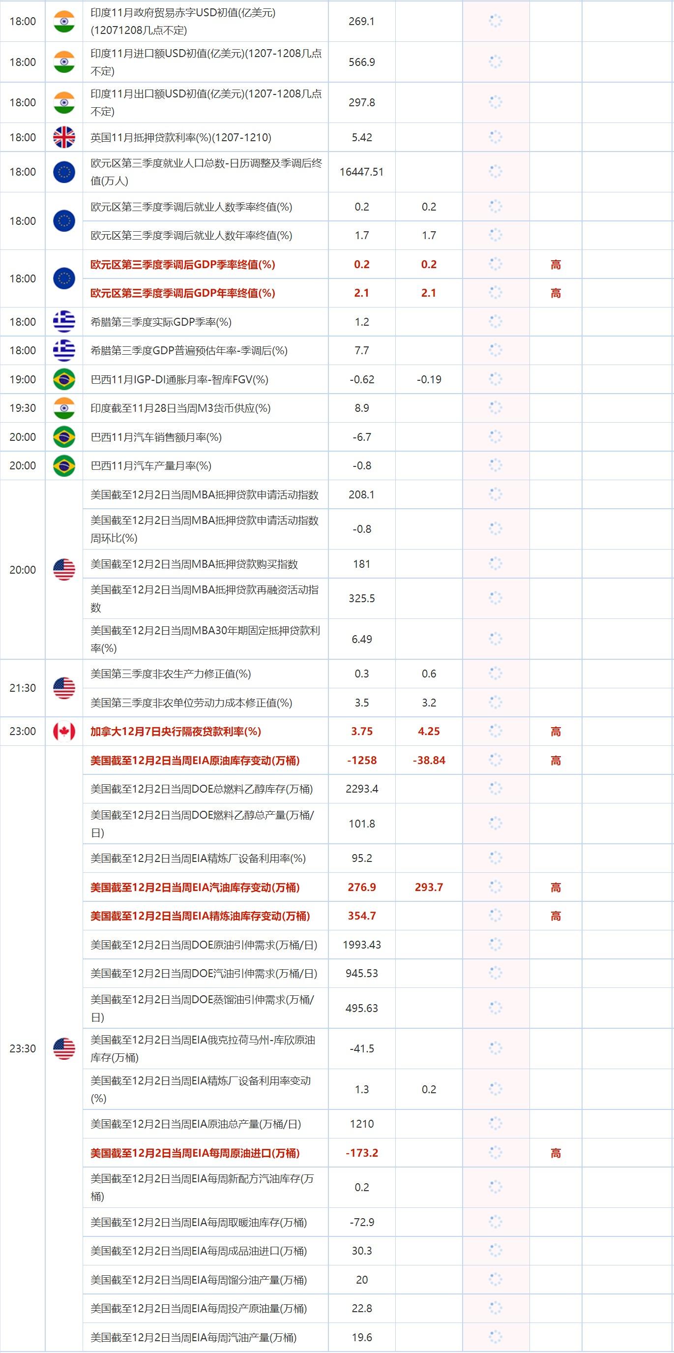 23:00 加拿大12月7日央行隔夜贷款利率(%) , 前值 3.75 , 预期值 4.25 , 公布值:待发布23:30 美国截至12月2日当周EIA原油库存变动(万桶) , 前值 -1258 , 预期值 -38.84 , 公布值:待发布23:30 美国截至12月2日当周DOE总燃料乙醇库存(万桶) , 前值 2293.4 , 预期值 -- , 公布值:待发布