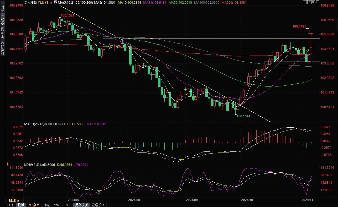 特朗普在美国总统大选中获胜,引发美元大幅反弹,创下7月3日以来新高,推动股市创下历史新高,并打击债券价格,因为减税和加征进口关税的预期推动了对经济增长的乐观情绪,同时加剧了对通胀的担忧。美国主要股指飙升,