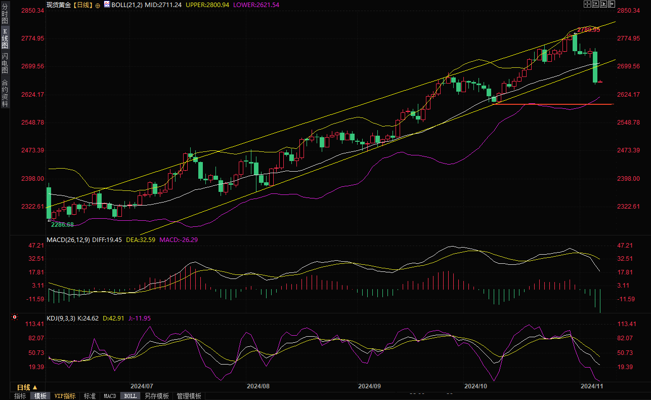 本交易日还将出炉美国初请失业金人数变动,投资者需要予以关注,此外,留意市场对特朗普胜选影响的进一步解读情况。重点关注北京时间周五凌晨3:00的美联储利率决议和03:30的美联储主席鲍威尔新闻发布会。技术面来看,日线级别,金价跌破了布林线中轨和7月份以来上涨通道,后市可能会进一步下探布林线下轨2621.56附近支撑和10月10日低点2602.54附近支撑。