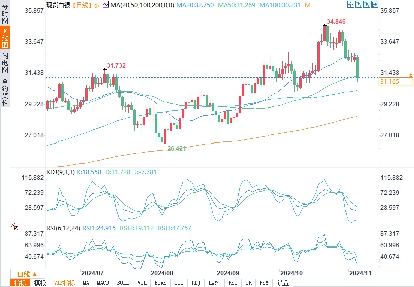 汇通财经APP讯——周三(11月6日)美盘时段,银价大幅下跌,徘徊在关键的50日移动均线31.29美元附近,因美国国债收益率飙升和美元走强令银价承压。目前正在测试该支撑位,银价的下一个目标可能是30.67美元的轴心点。分析师指出,尽管该水准可能出现技术性反弹,但若未能守住该水准,则可能预示金价将进一步向200日移动均线切入位28.49美元下滑。