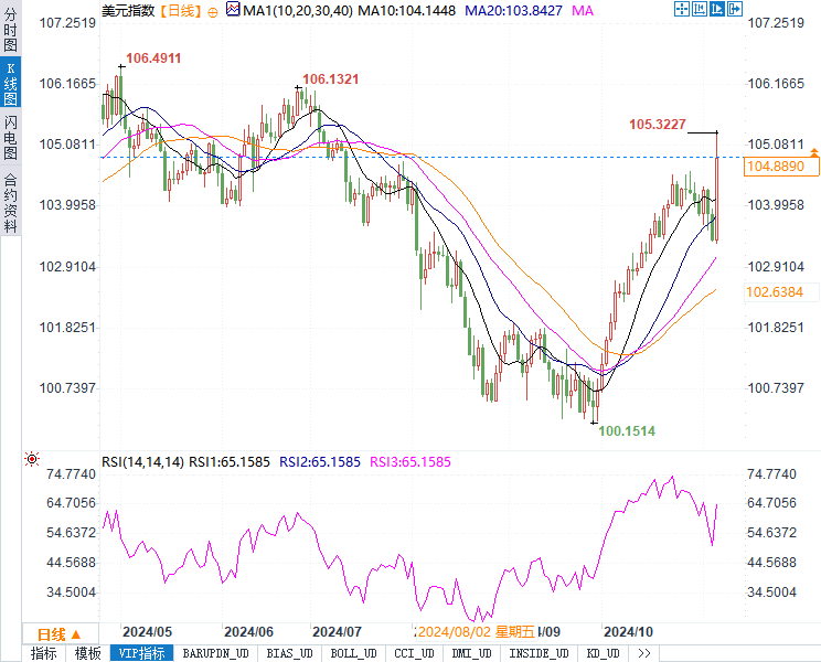 美元指数上涨1.46%,至104.9222点,这是自2023年3月以来的最佳单日表现,并且盘中一度触及105.3227高点。交易员们对特朗普的财政、关税和移民政策预期激增,认为这可能引发通胀并推高美国国债收益率。北欧联合银行首席分析师尼尔斯·克里斯滕森指出,“市场反应非常强烈,美元大幅上涨。”他进一步补充道,这一财政政策预期和紧张的劳动力市场带来的通胀压力,将推动美元继续走高。