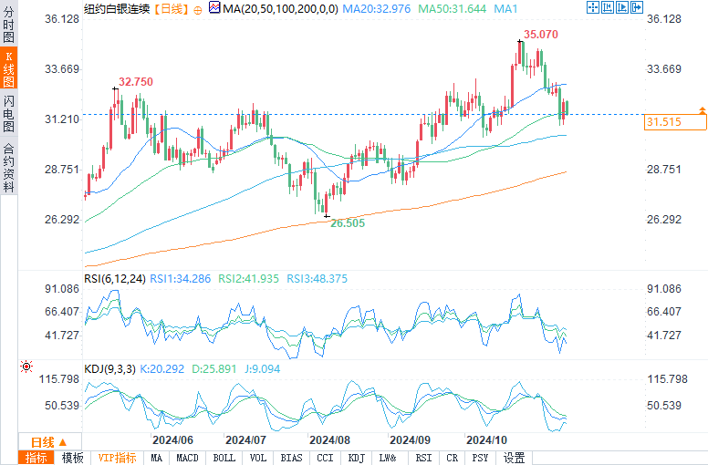 现货白银报31.438美元/盎司,跌幅1.79%。COMEX白银报31.565美元/盎司,跌幅0.91%。