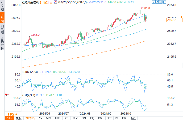 现货黄金报2691.66美元/盎司,跌幅0.54%。COMEX黄金报2699.3美元/盎司,跌幅0.24%。