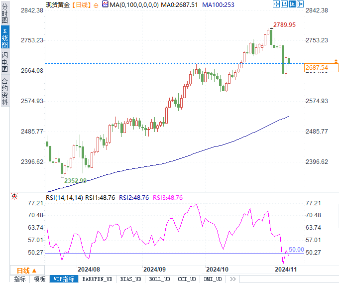 现货黄金当前报2689.76美元/盎司,跌幅0.61%,在美国政局变动引发的短暂避险浪潮后,黄金未能进一步走高。市场观察到,特朗普胜选引发的通胀预期刺激了美元走强,打压了黄金的上行动力。随着美联储对未来利率走势的谨慎表态,黄金多头虽有支持,但涨势仍然受限。