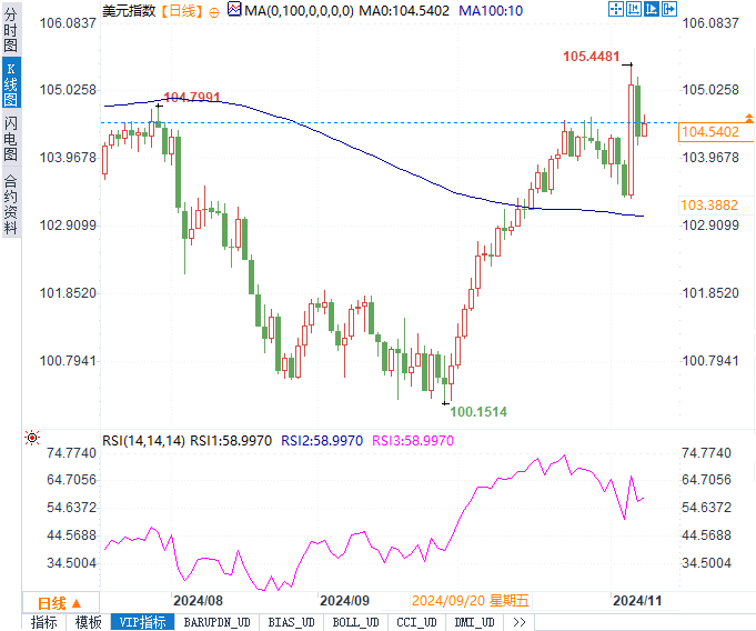 美元指数报104.5012,涨幅0.16%,呈现出良好的支撑态势。市场情绪受到特朗普当选所带来的未来加征关税预期的刺激,导致