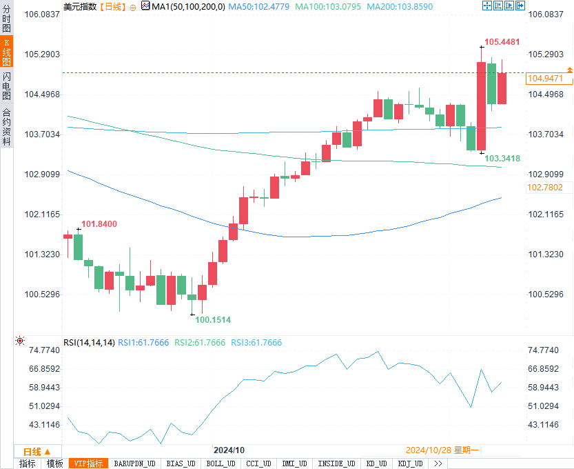 美元指数(DXY)表现稳健,周线涨幅为0.68%。在特朗普赢得总统选举后,市场普遍期待其经济政策将促进增长与通胀,但目前政策具体细节仍存在较大不确定性。美元周三一度触及四个月高位105.44,随后略有回落,最终收报105.01,周涨幅实现0.58%。