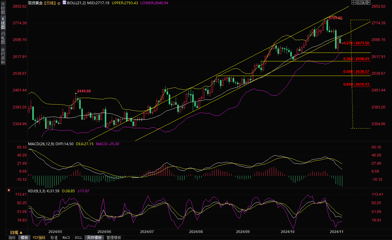 金价上周五下跌0.8%,收报2684.37美元/盎司,周线下跌1.85%,创下五个多月来最大单周跌幅,受美元走强打压,市场消化特朗普胜选的影响及其可能对美国利率预期产生的影响。