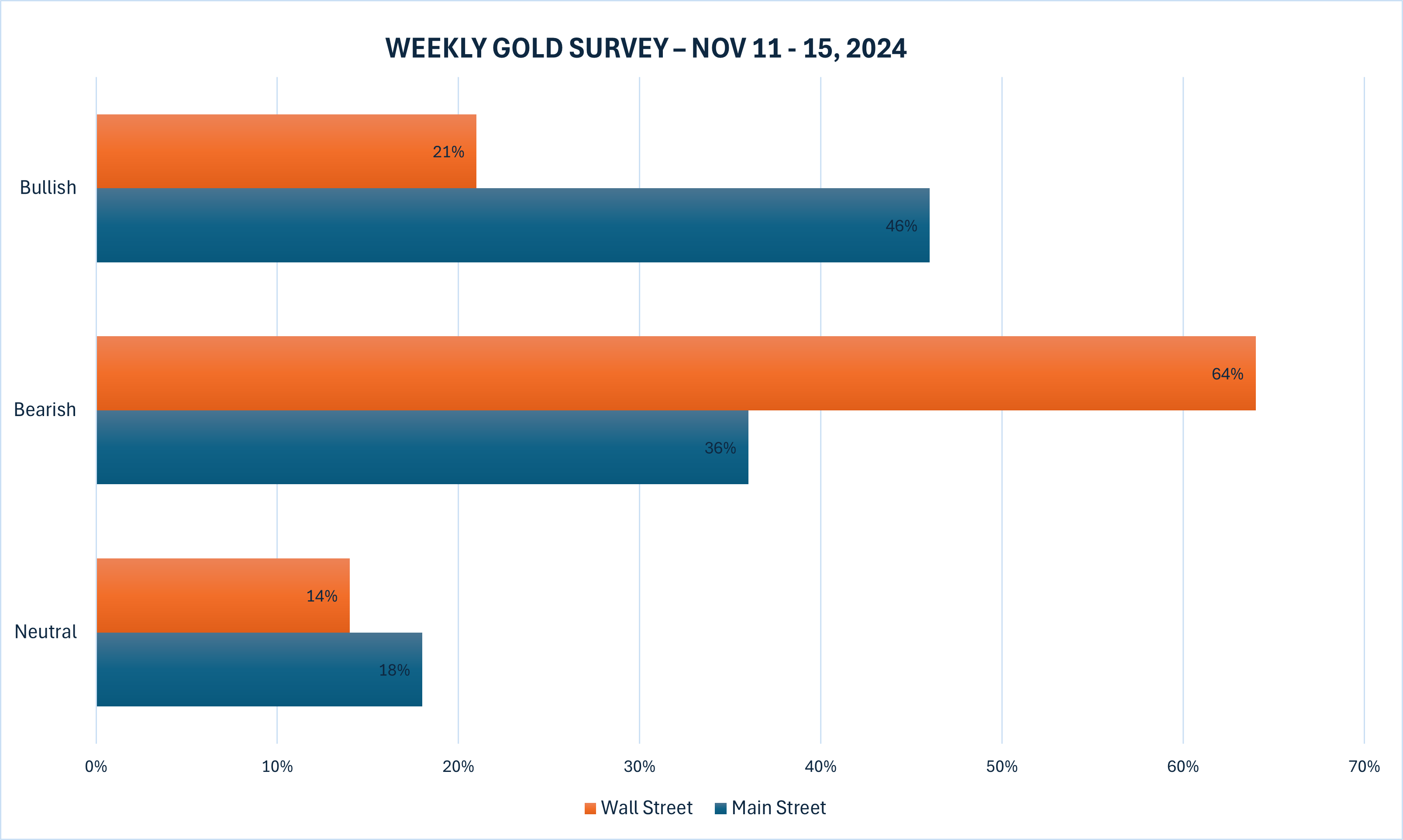 地缘局势方面,俄乌冲突仍在持续,拜登打算在下台前,加速给乌克兰提供武器,而中东战火也仍在延续,这也在中长线限制金价的回调空间。有 14 名分析师参与了 Kitco News 黄金调查,上周的大幅抛售使得华尔街多数人对前景持悲观态度。