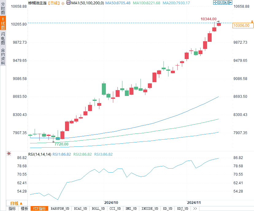 从技术面来看,棕榈油期货升破了万元关口,创下近两年半新高,这一强势态势很可能在短期内继续。整体看,市场维持牛市氛围,未来数月内供应紧张将为其提供持续支撑。
