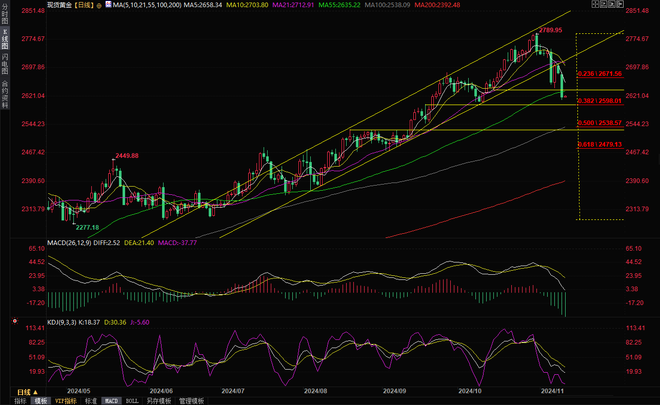 技术面来看,日线级别,金价跌破了55日均线2633.43关键位置,也初步跌破了布林线下轨,MACD即将下穿零轴,若不能快速回升至55日均线2633.43上方,