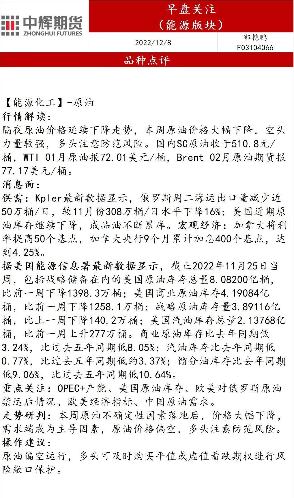 中辉期货能源早盘关注:多头可及时购买平值或虚值看跌期权进行风险敞口保护