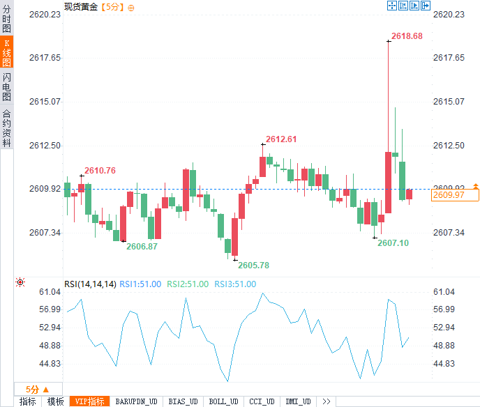 现货黄金短线冲高10美元,后小幅回落,现报2610.55美元/盎司。