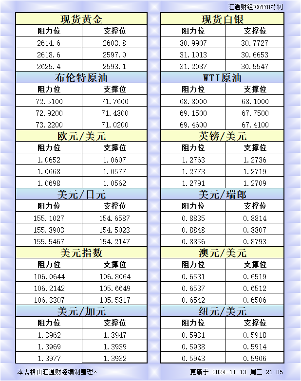 标题:11月13日美市更新的支撑阻力:金银原油+美元指数等八大货币对