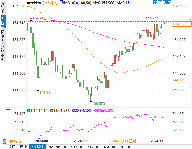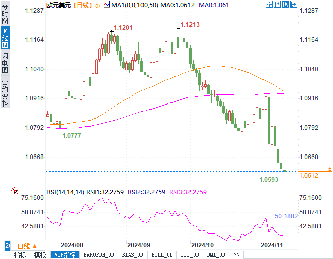 欧元兑美元在1.0614附近低位徘徊,接近一年低点。随着德国总理朔尔茨领导的执政联盟崩溃,德国政治局势的不确定性对欧元构成压力。裕信银行分析师团队在报告中表示:“核心CPI的稳定以及总体通胀的回升可能进一步支撑美元。当前市场情绪表明,美元的回调将被视作买入机会。”此外,欧元的技术图形显示,下方支撑位在1.0550,若跌破此位,可能进一步测试1.0500大关。