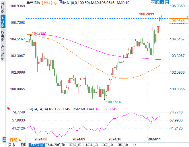 美元指数连续四个交易日走强,触及106以上的六个半月新高,美元兑主要货币的强势表现一方面受到美国政治局势影响,另一方面也是市场预期通胀数据可能会影响美联储未来降息节奏。知名机构分析认为,美元的上涨空间可能仍未耗尽,特别是如果通胀数据表现强劲,美元将迎来进一步的上升支撑。
