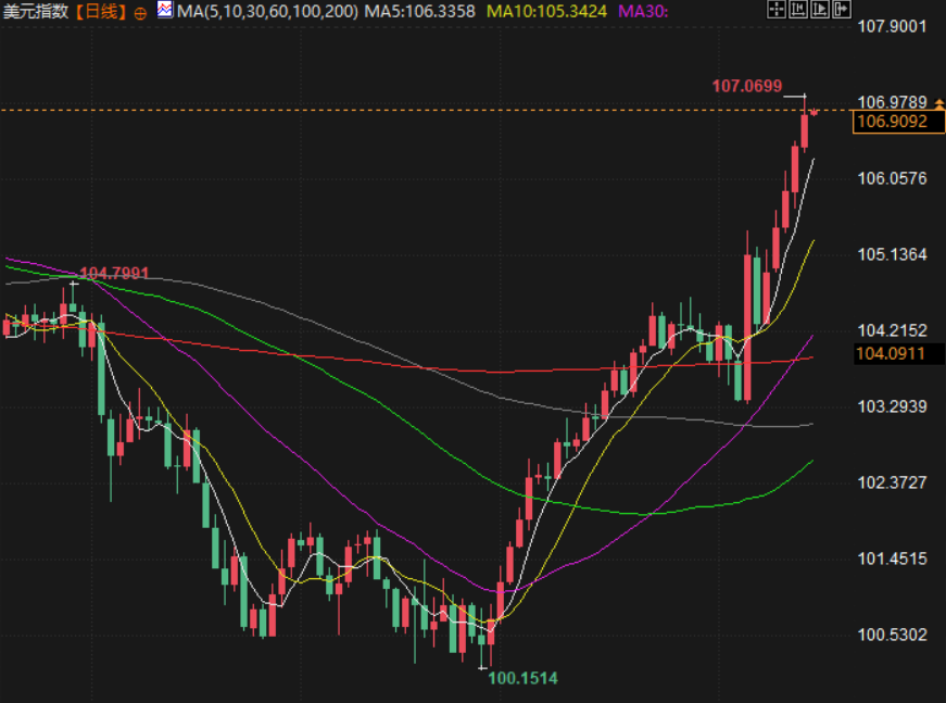 美元兑主要货币周四走强,盘中创下一年新高至107.07,并连续第五个交易日上涨,继续受特朗普赢得大选将重返白宫以来市场的预期推动。