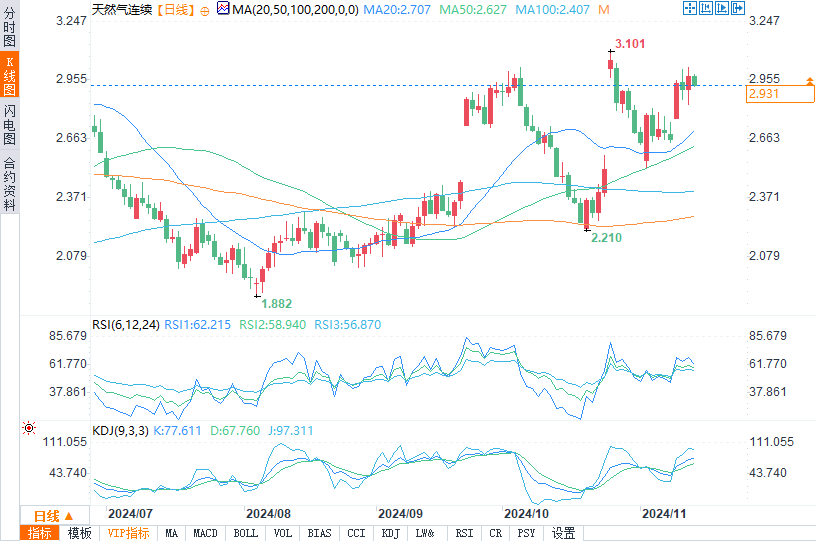 周四(11月14日)美盘时段,美国天然气价格小幅走低,投资者等待美国能源情报署(EIA)最新的政府储存报告。近期需求仍然温和,尽管本月晚些时候天气将变冷的预测表明潜在需求增加。短期内,交易员预计会有一个看跌的库存报告,这可能会加大价格下跌的压力。