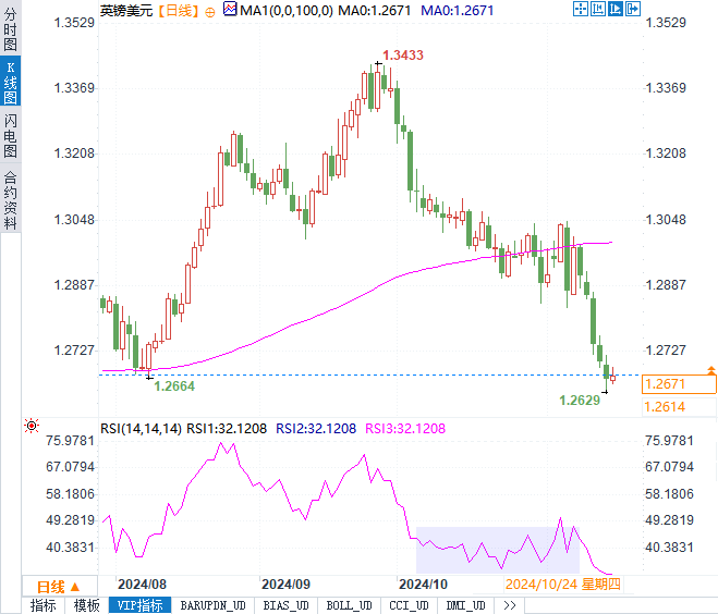 英镑兑美元走势持续低迷,目前报1.2662,本周累计跌幅接近2%,为2023年1月以来的最大周跌幅。英国经济数据疲弱加剧了市场对该国经济前景的担忧。尽管如此,英镑在1.26附近显示出一定韧性,短期内可能出现技术性反弹。
