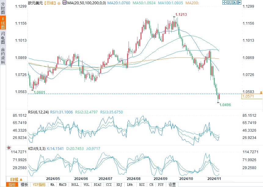 欧元/美元在周四的交易中跌至2023年10月以来的新低。最低价达到1.0495。目前欧元/美元止跌并小幅上涨。