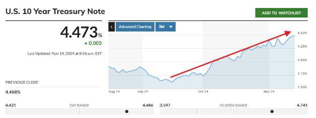 分析师表示:“这有助于解释为何10年期美债收益率直线走高。尽管美联储已降息75个基点(9月份出人意料地降息50个基点),但通胀仍在上升。许多人认为,抵押贷款利率下一步将升至8%以上。”