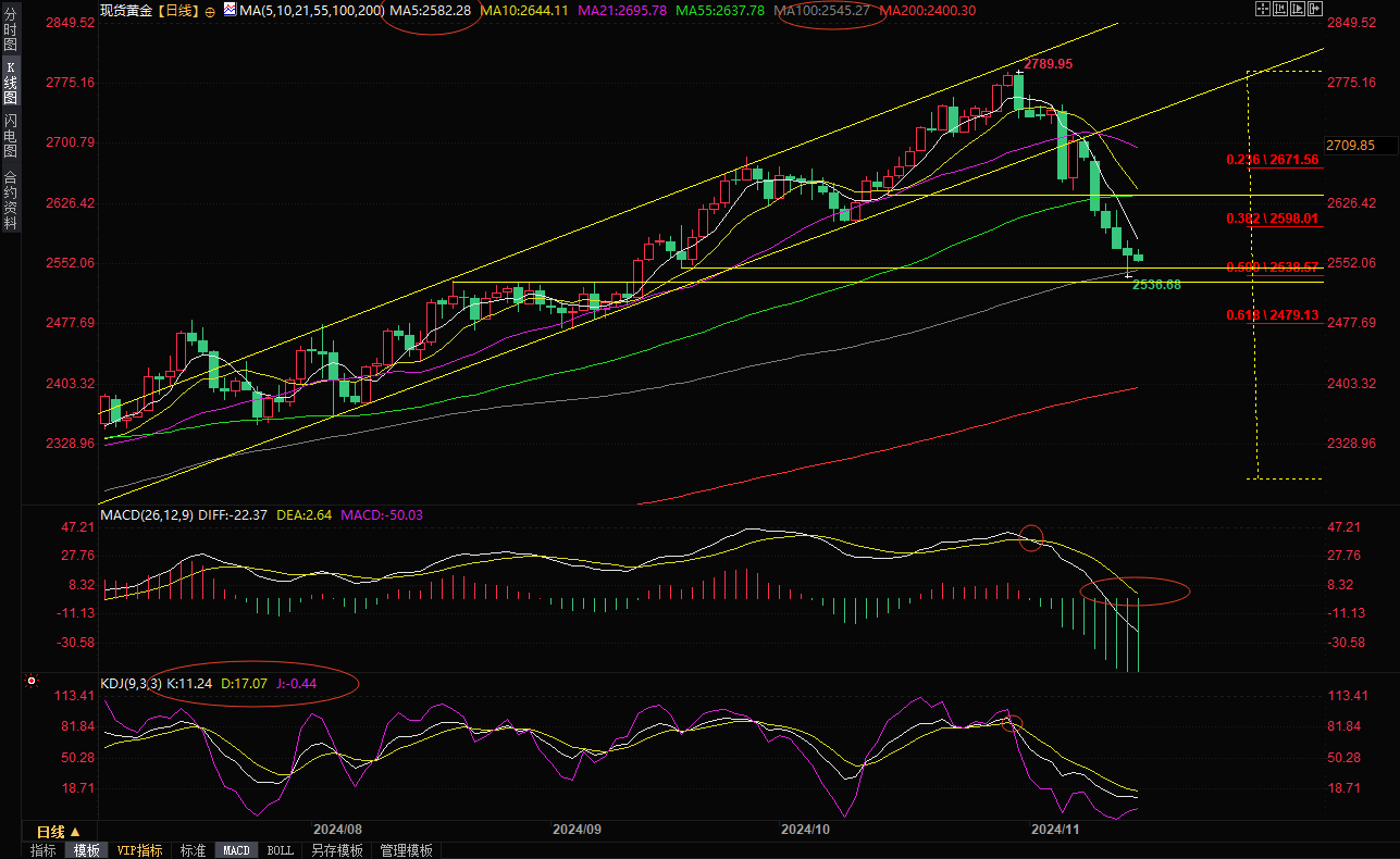如果金价能够收盘于5日均线2582.12上方,则削弱后市看空信号。