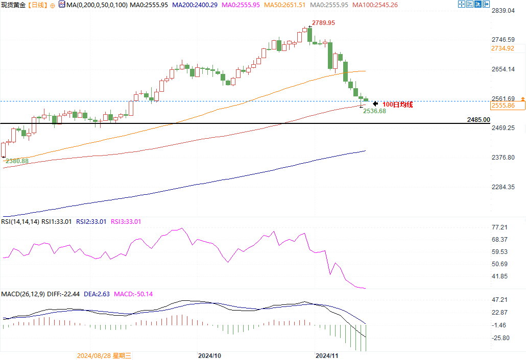 金价100日均线附近挣扎!若有效跌破,恐下探2485美元