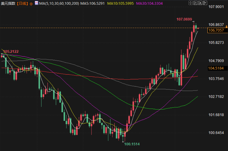 美元指数上周五交投在107.07的一年高位附近,上周上涨近 1.65%,创下 9 月以来的最佳单周表现。市场重新评估对未来降息的预期,并认为当选总统特朗普的政策可能会引发通胀。市场预期特朗普政府的政策(包括关税和减税)可能会刺激通胀,从而使美联储降息的空间减小,美元因此受益。