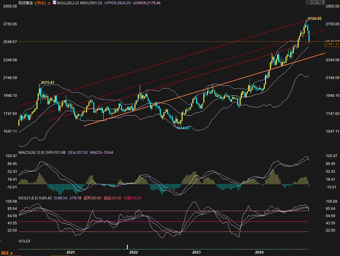 整体来看,金价虽然出现了暂时企稳迹象,不过由于底部形态还没有出现,因此冲高后可能还有新低,如果能在上升支撑线附近形成“探底神针”的阳线,那将是一个积极的信号。按照通常的筑底模式来说,通常需要底部盘整很久之后出现一波快速下跌形成一个新的低点,并且快速受到买盘支撑。而这个新的低点,有可能需要关注2515-2500区域,其中2501也是周线布林带中轨当前切入位。通常来说,周图在最近九个月还没有测试过布林带中轨,理论上是一个比较值得关注的支撑。不过危险的信号在于,MACD处于严重超买区域的高位且出现死叉状,KDJ也是高位死叉,可能会给想要做多者一个极大的威慑。整体来说,还是处在严重超买的一个回调需求中。