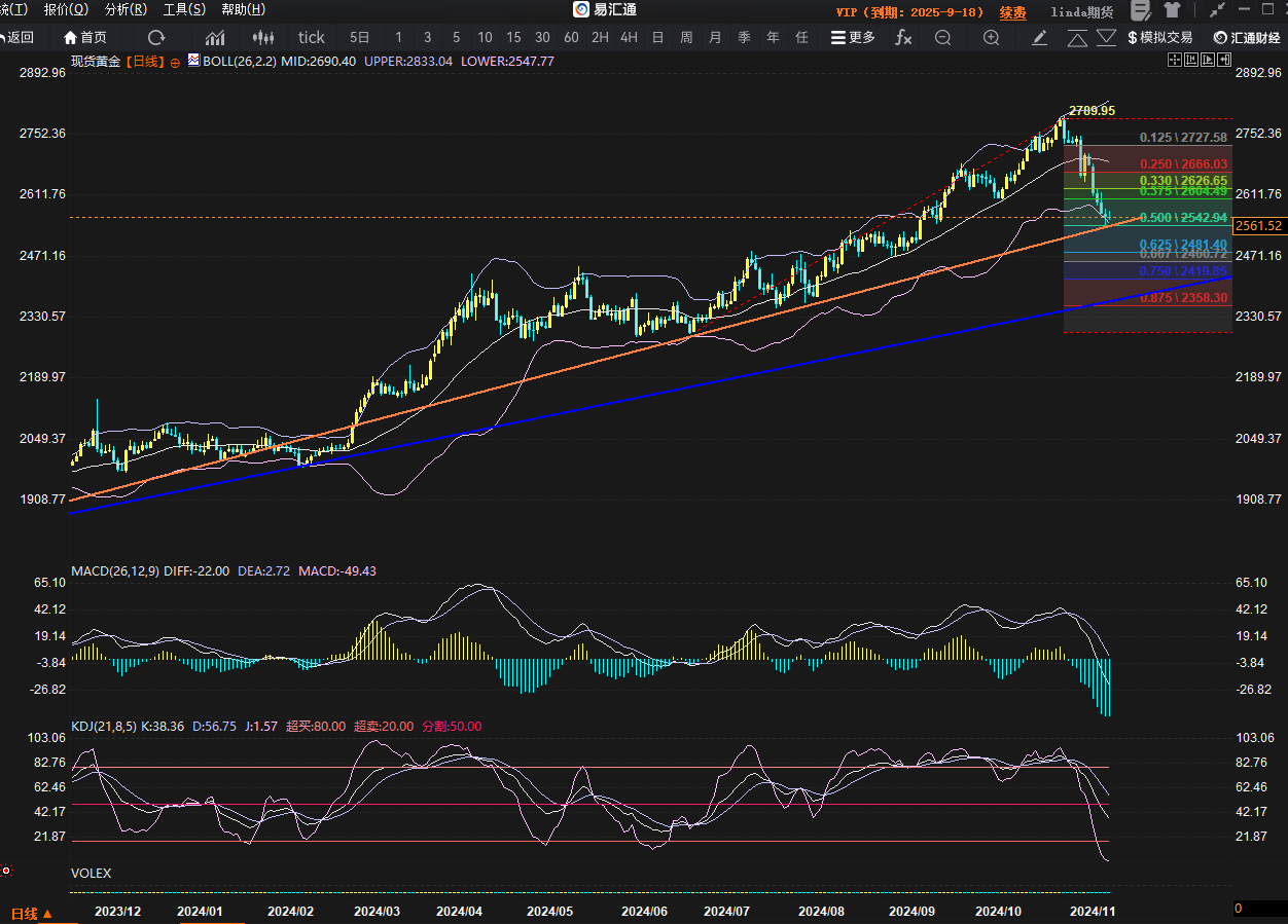 金价11月14日所创的近两个月(即9月12日以来)最低水平2536.68美元/盎司,从盘面来看,金价这个低点附近汇集了好几个重磅支撑:该低点相当于测试了100日均线、涨势区间2296-2790区间的50%回档,两者目前都处在2542.9水平,这也是最近九个月以来金价首次测试100日均线,按周期倍数刚好也是周线级别的20均线。同时,最低点也刺穿了日线布林带下轨,然后回到下轨附近挣扎。另外,此低点还测试了如图橙色粗体倾斜直线。周线则是矮脚大阴柱,日图的测试情况是纺锤线+阴孕星线,可能会弱反弹但还不是形成底部的必要条件。因此,本周金价想要出现像样的反弹,可能需要在15分钟及以上级别出现一根“探底神针”(长脚小实体阳线),一旦出现将迅速吸引到多头人气。